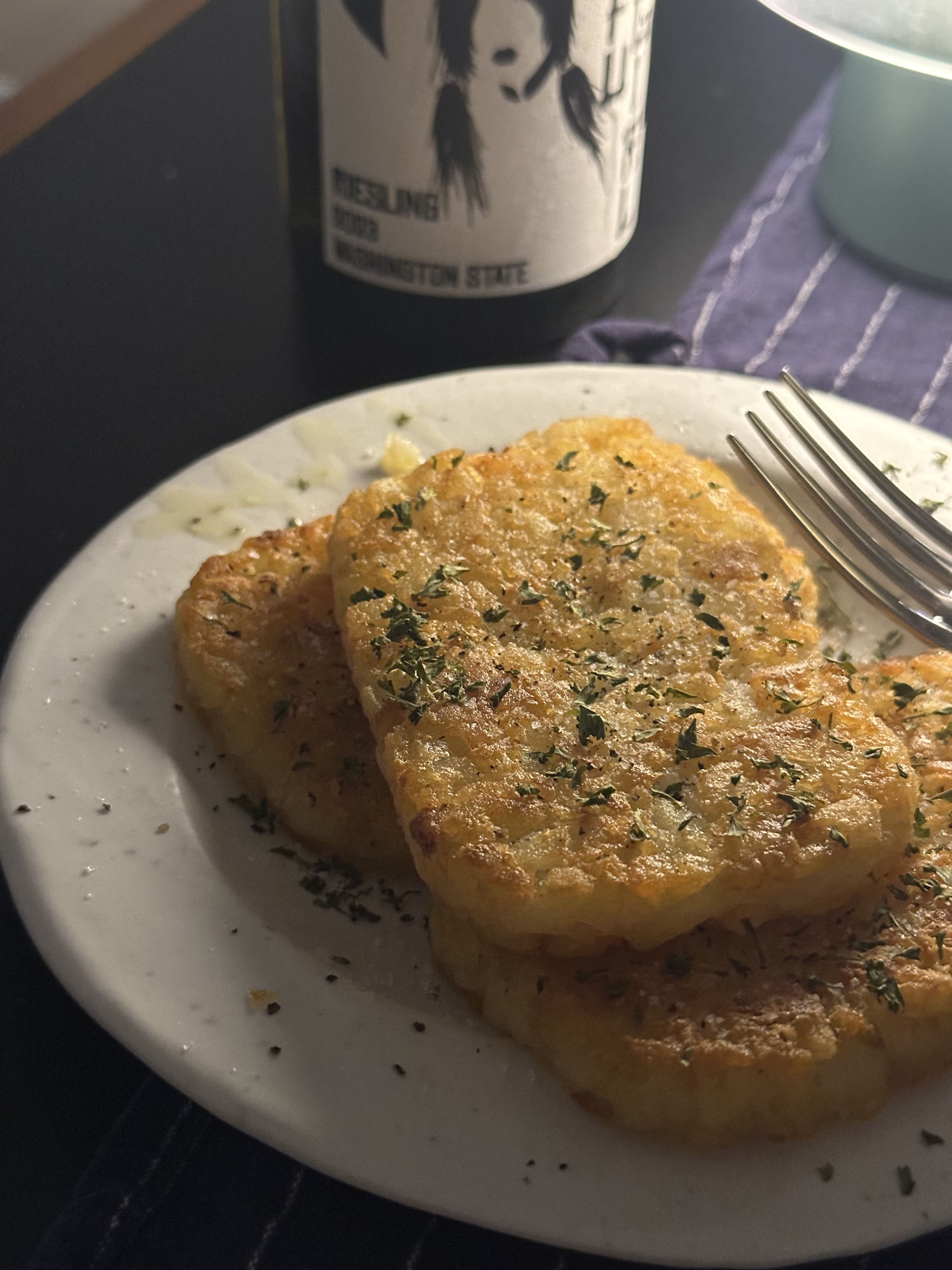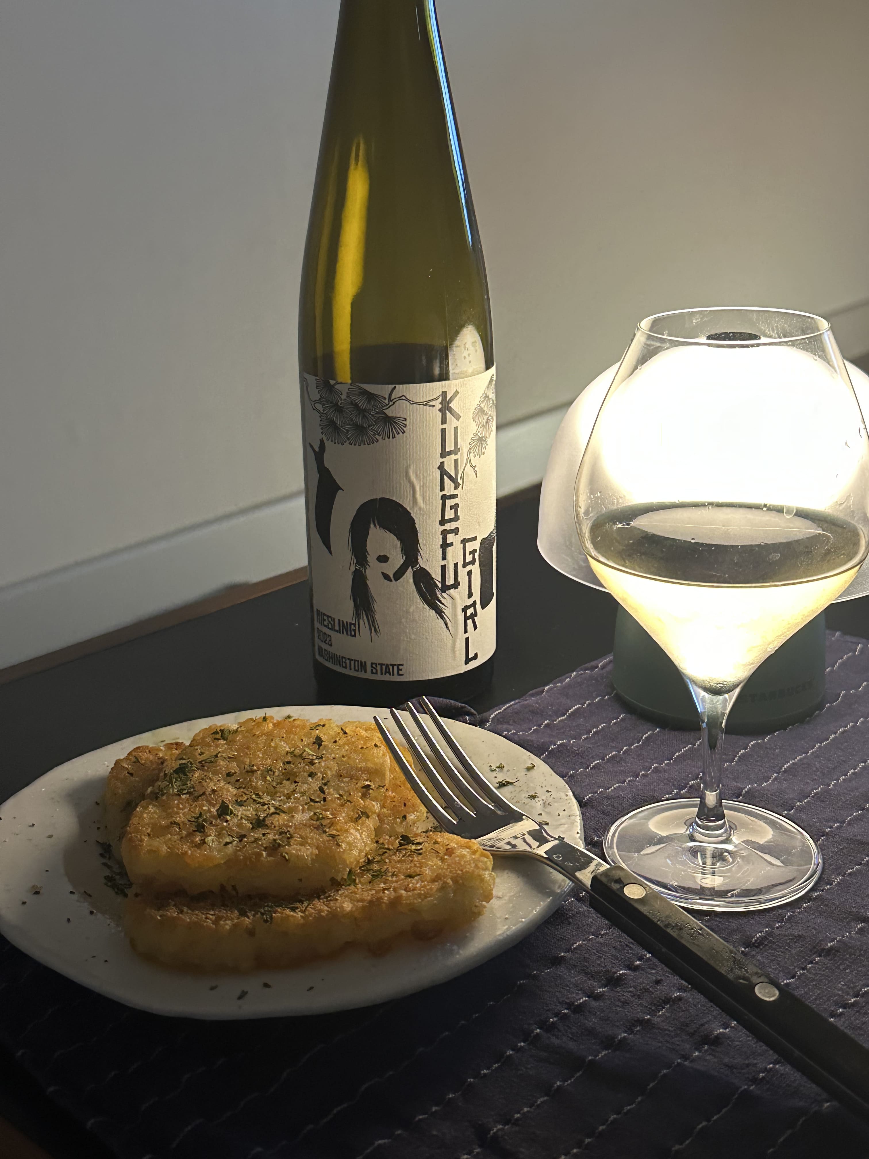 아주 간단하게 먹을 때는 해쉬브라운과 와인을 곁들이기도 합니다. 해쉬브라운의 바삭함 식감과 짭조름한 맛이 쿵푸걸의 달달하면서도 밸런스 있는 바디감, 청량함과 페어링이 상당히 좋습니다.