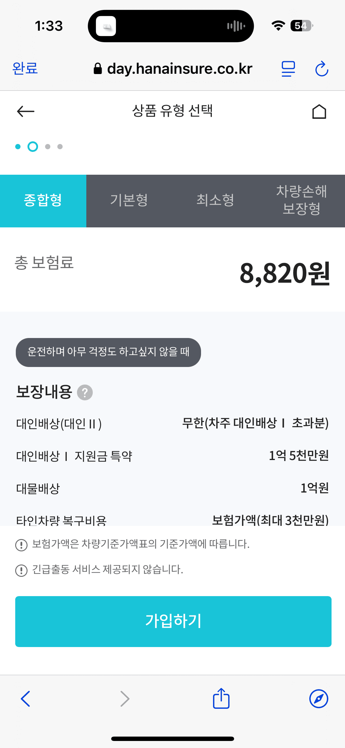 저는 종합형 보험을 선택했어요. 하루 차이지만, 사고가 났을 때를 생각하면 보장은 넉넉한 게 낫겠더라고요. 특히 하나손해보험의 보장 혜택과 범위가 괜찮다는 판단입니다.