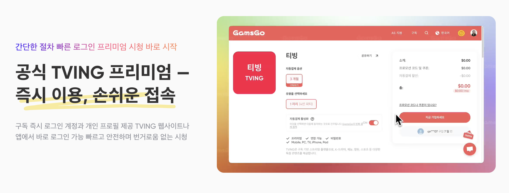 그래서 찾은 방법이 바로 겜스고(GamsGo)라는 해외 구독 플랫폼을 활용하는 방식이었습니다. 오늘 글에서는 겜스고가 어떤 서비스인지, 어떻게 티빙을 저렴하게 구독할 수 있는지, 그리고 실제 사용 후기까지 꼼꼼히 정리해드리겠습니다.