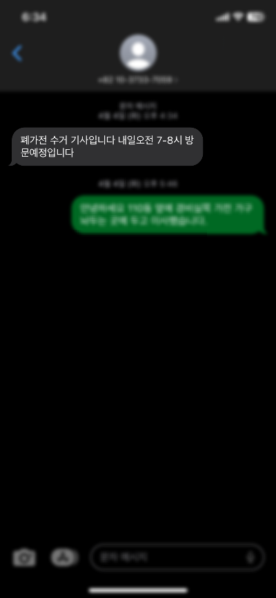 문자를 먼저 주셨고, 이사를 오면서 세탁기를 밖에 내놓은 덕에 문자하나로 수거가 완료되었습니다. 이런 서비스를 몰라 작년에 사용하던 건조기를 힘들게 버렸던 저를 생각하니, 참 안타까웠습니다.