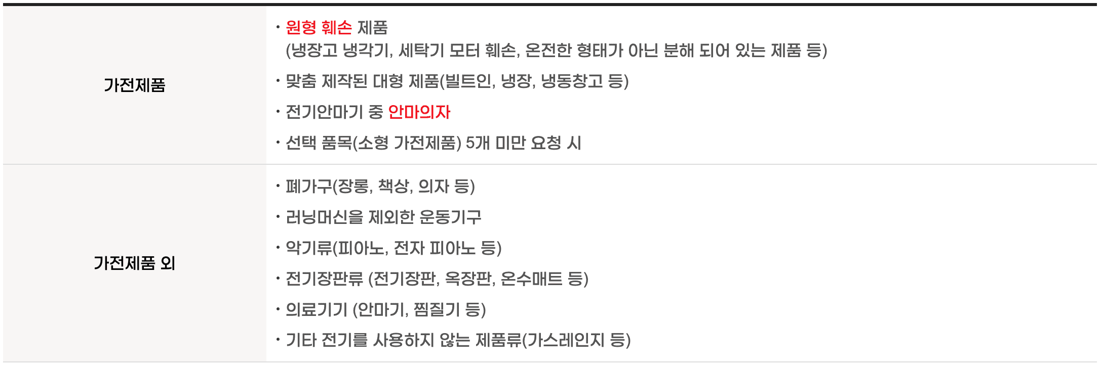 - 에어컨, 벽걸이 TV, 공유기, CCTV 등 설치가 된 제품은 서비스 이용 전에 철거가 되어 있어야 수거 가능합니다.