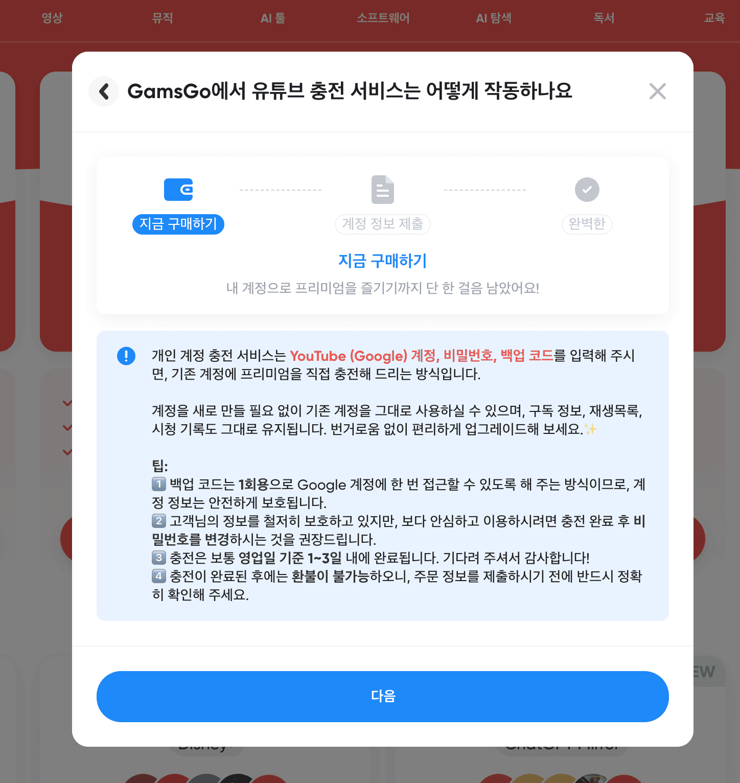 구글이 2024년부터 가족 플랜 지역 제한·무단 공유 단속을 강화하면서, 기존 ‘가족 그룹 초대’ 방식이 자주 차단되는 문제가 발생했습니다. 이에 겜스고는 공식 YouTube Premium Individual Plan을 고객 개인 계정에 직접 충전하는 대안을 도입했습니다.