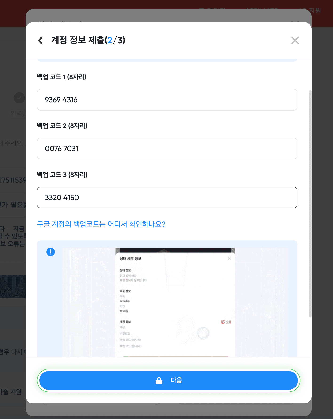 백업코드가 뭔가 싶으신 분들이 많으실 텐데, 걱정 안 하셔도 됩니다. 결제 후 정보 기입 페이지에서 어떻게 백업코드를 넣을 수 있는지 자세히 나옵니다.