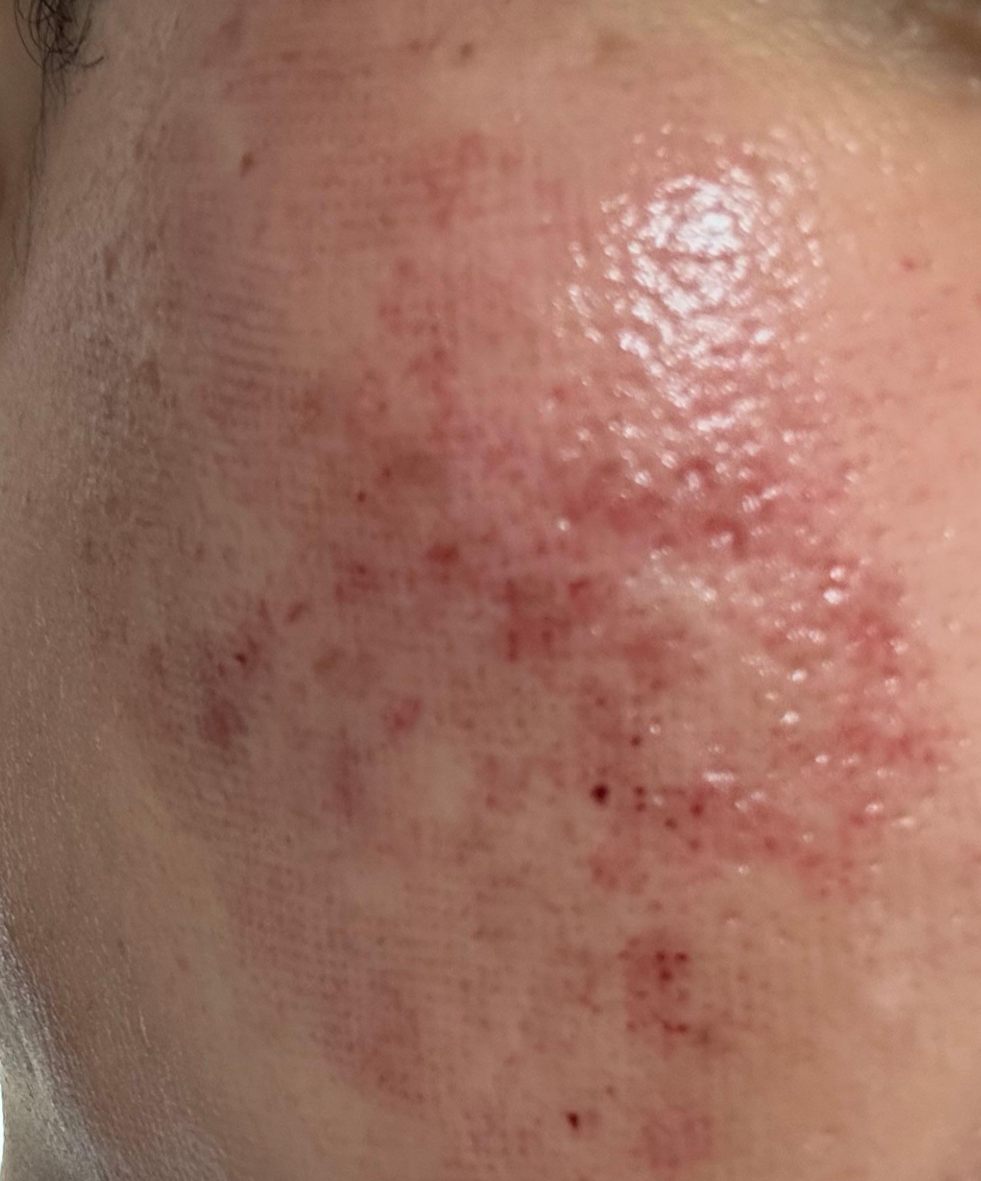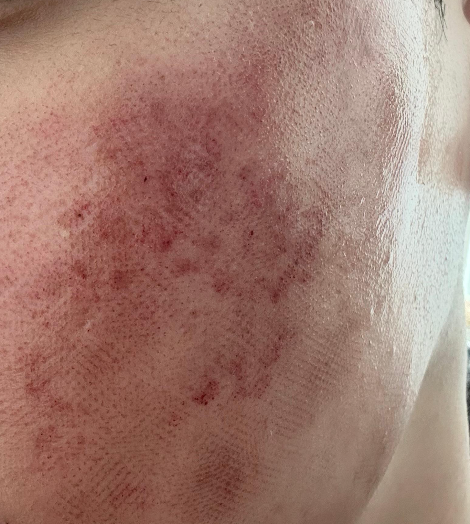 시술 직후는 아무래도 붉은 끼가 많이 올라옵니다. 피부를 보시면 아시겠지만 프락셀 특유의 점박이 무늬가 피부에 남아있습니다. 이거 찍을 때는 열감과 통증이 심했습니다.