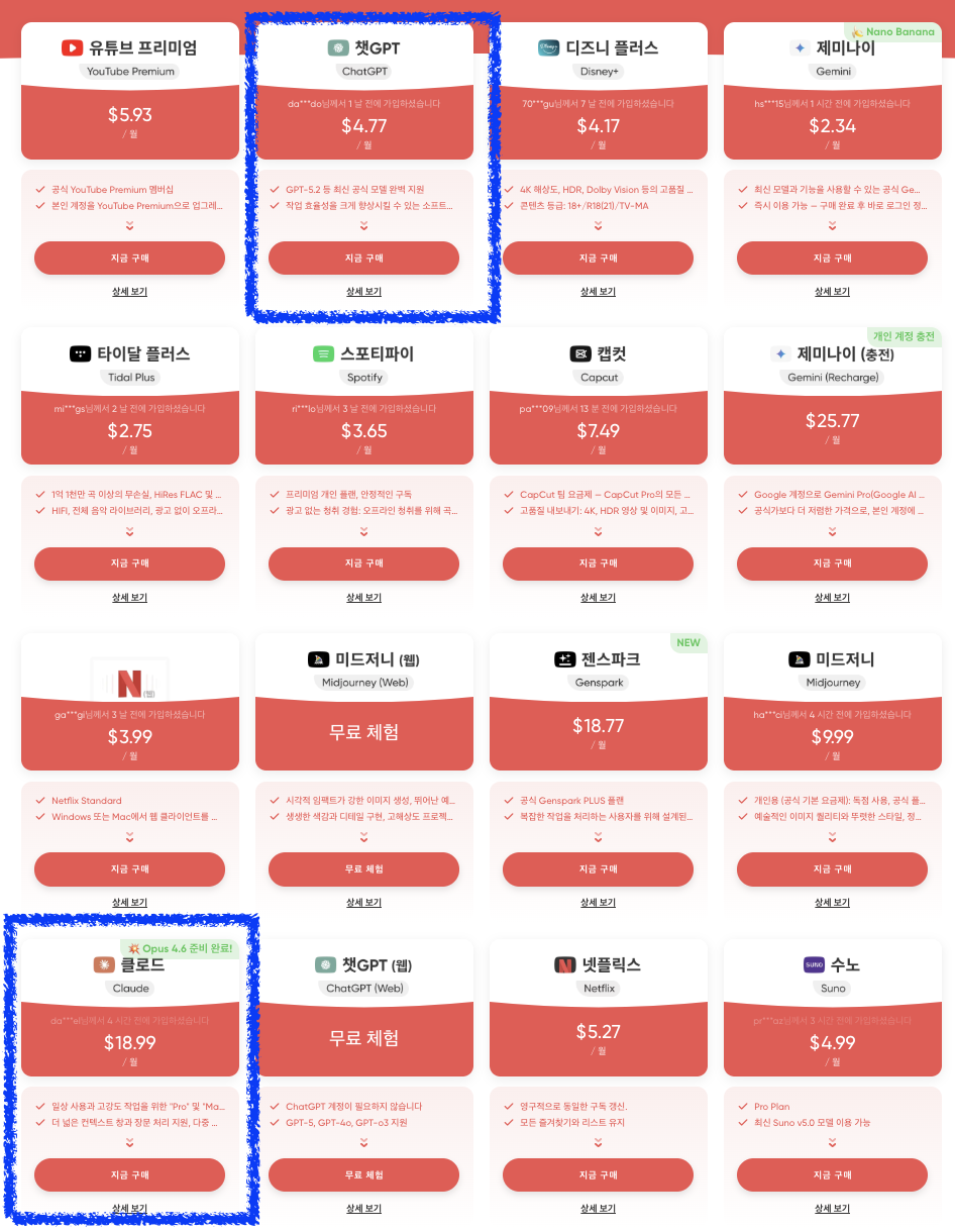 로그인 후에는 내가 찾고 있는 상품을 찾아야됩니다. 위치는 항상 달라져서 아래 이미지와 다를 수 있어요. 챗지피티와 클로드는 상단에 위치한 편입니다. 사람들이 많이 찾는 이유도 있겠죠?